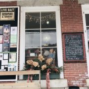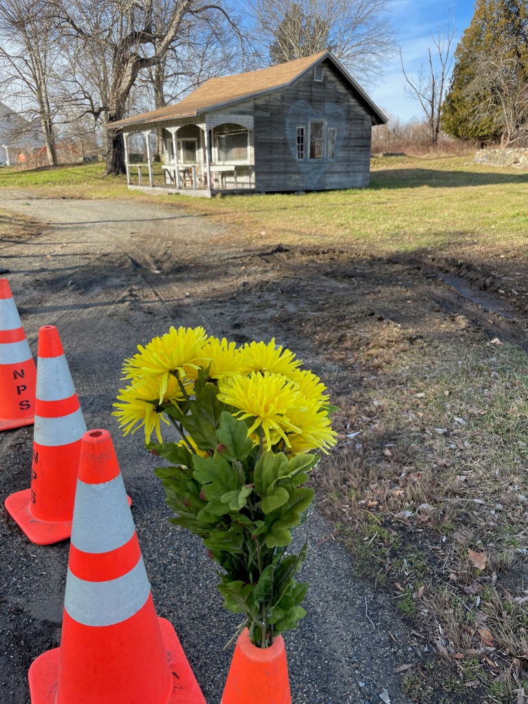 As I kept traveling on Lexington Road, house after house had the orange fencing. Until I reached my favorite little farm stand – the Albano Farmstand. There was no orange fencing. Instead, the circular driveway was blocked off by orange traffic cones. And on the east side of the farm stand, someone had painted a blue heart around the windows. On this gray, dreary day, the heart stood out. But, what did it mean for this building? Was it not going to be rehabbed like all the other buildings on this stretch were going to be? Who drew the heart? What did they know about its future? Why were there now two oak dining room chairs on the porch? Who put those there? Sadly, I drove away, determined to find out more about what was going on.